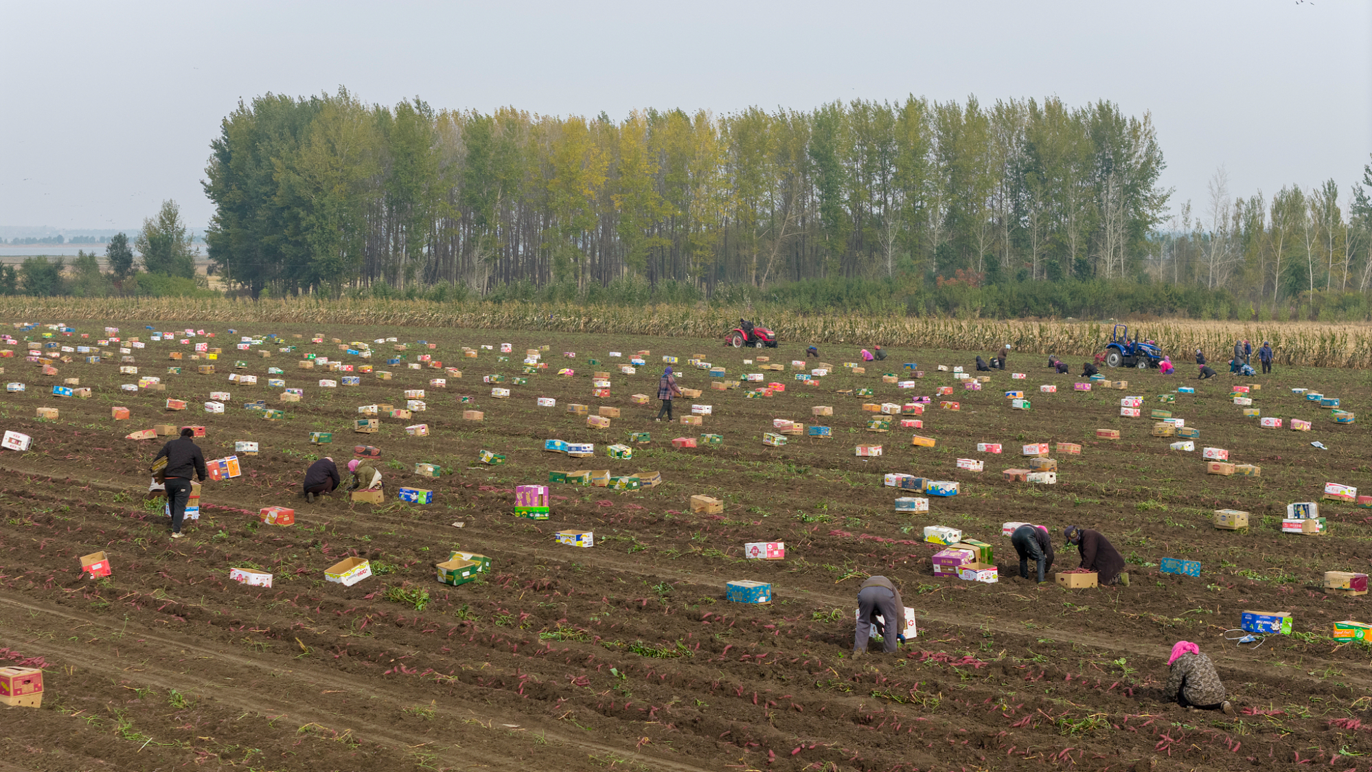 Poljoprivrednici iz okruga Kangping u gradu Šenjang u provinciji Liaoning, 16. oktobra beru slatki krompir, kupeći batat direktno sa polja i vraćajući se sa punim sanducima.