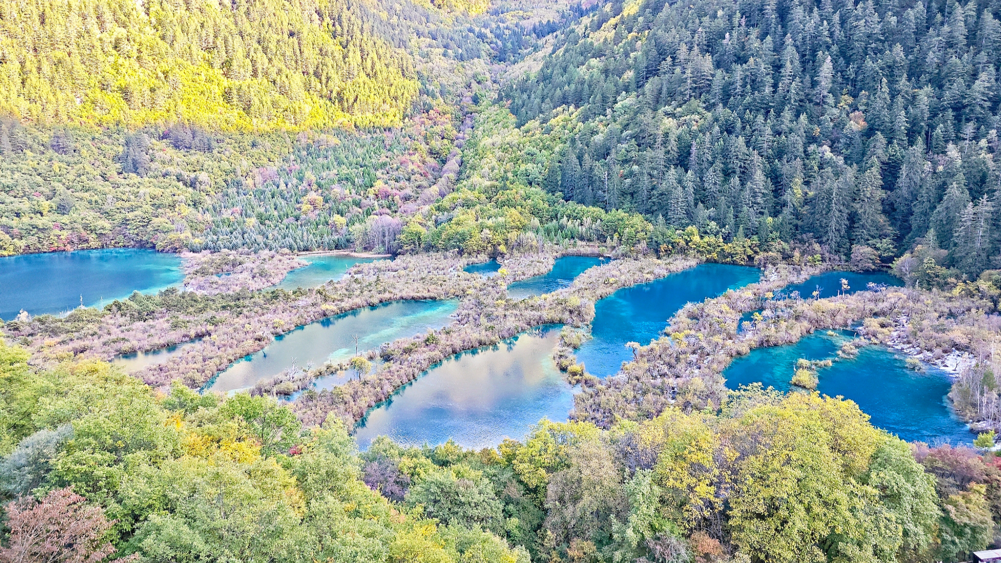 U okrugu Aba u provinciji Sečuan, tokom sezone crvenog lišća u Đudžajgou, Sunce sija, a pejzaži su poput slika.