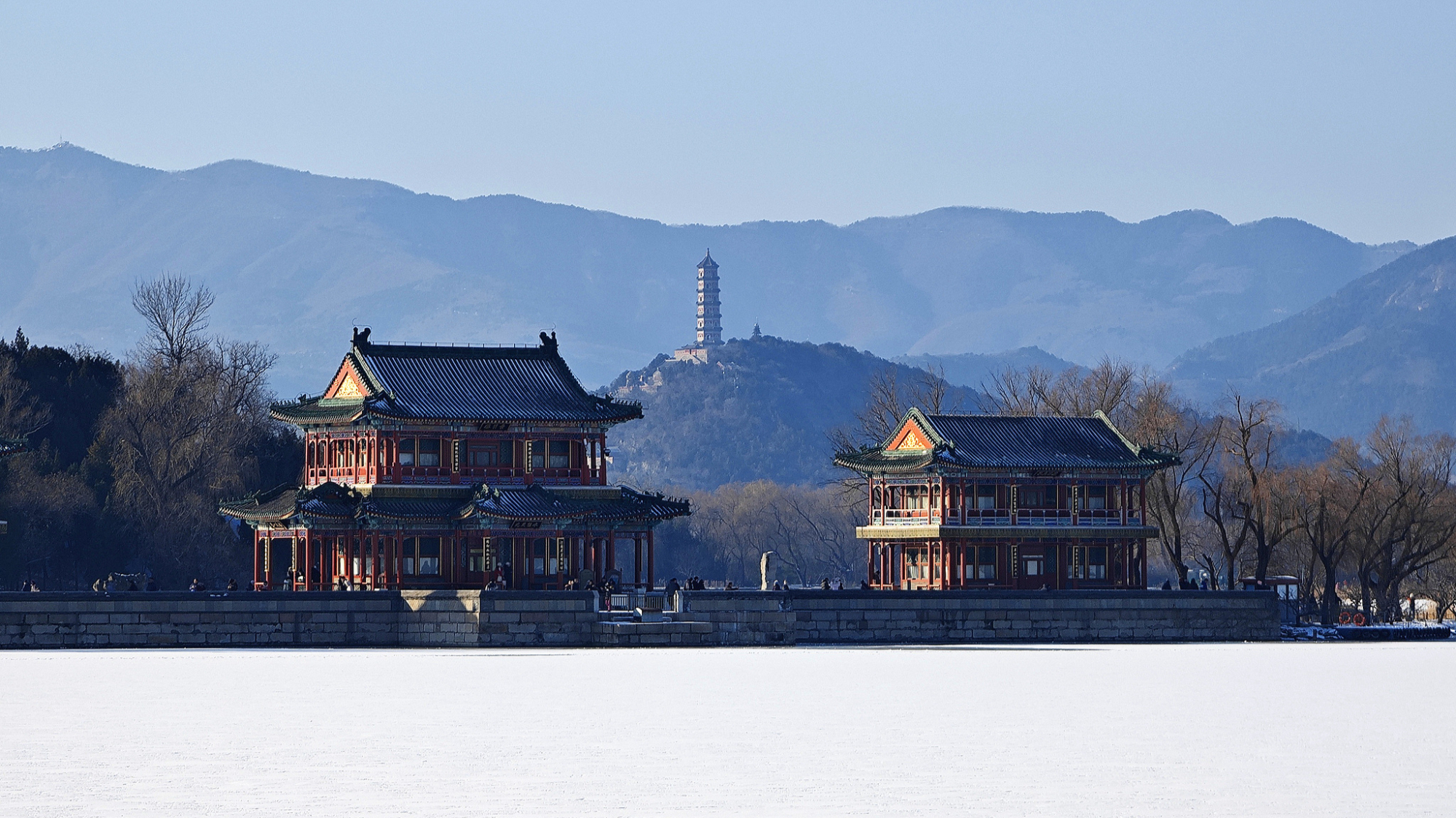 Pod vedrim plavim nebom, Letnja palata, kraljevska bašta, kupa se u netaknutom belom snegu, stvarajući osvežavajući i slikovit prizor koji je i poetičan i očaravajući, prikazujući lepotu zime.