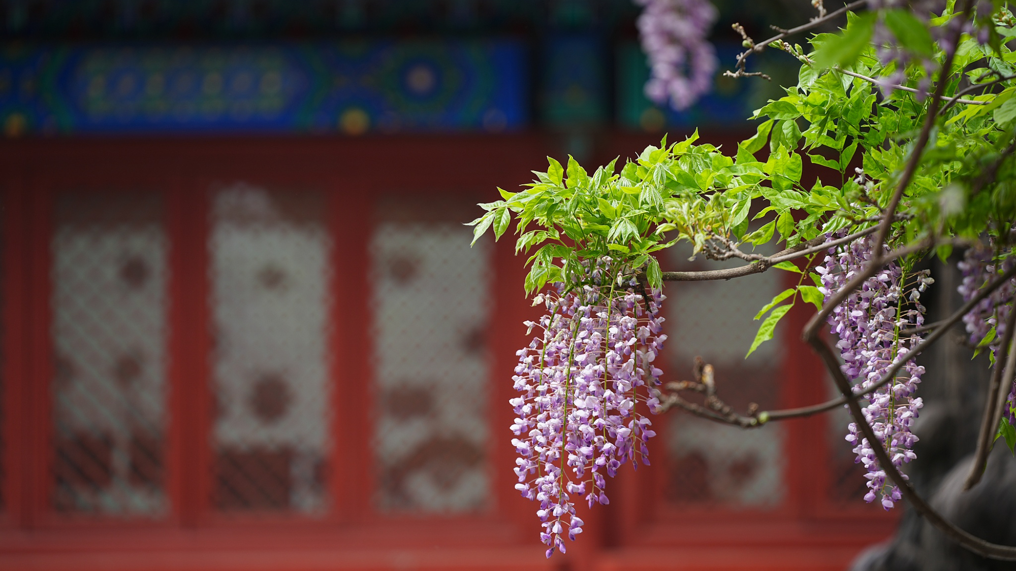 Glicinija cveta u Konfučijevom hramu u Pekingu, ispunjavajući baštu ljubičastom bojom.